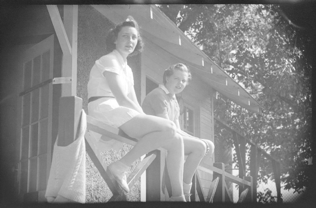 Deux joueuses de tennis, Evelyn Kimber et Doris Scott, sont assises sur la rampe d'un balcon