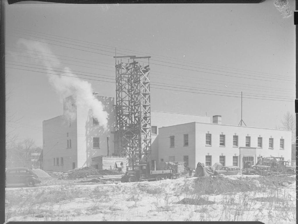 Nous voyons l'édifice de la Young Men's Christian Association (Y.M.C.A.) de Notre-Dame-de-Grâce à Montréal. Nous remarquons la charpente d'une construction à proximité