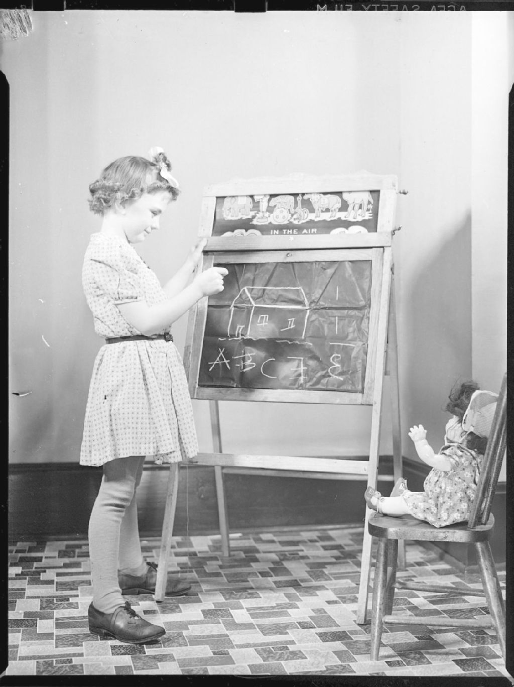 Une fillette, Shirley Greenwood, indique à sa poupée la maison qu'elle a dessinée sur une feuille fixée à un chevalet