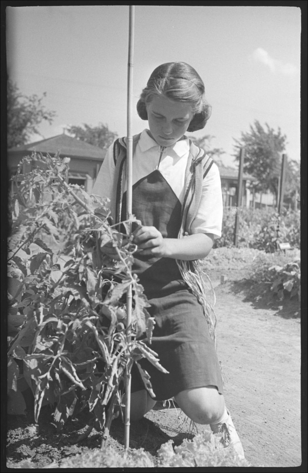 Une adolescente, Pierrette Delcourt, attache un plant de tomates à un tuteur dans un potager au Jardin botanique de Montréal