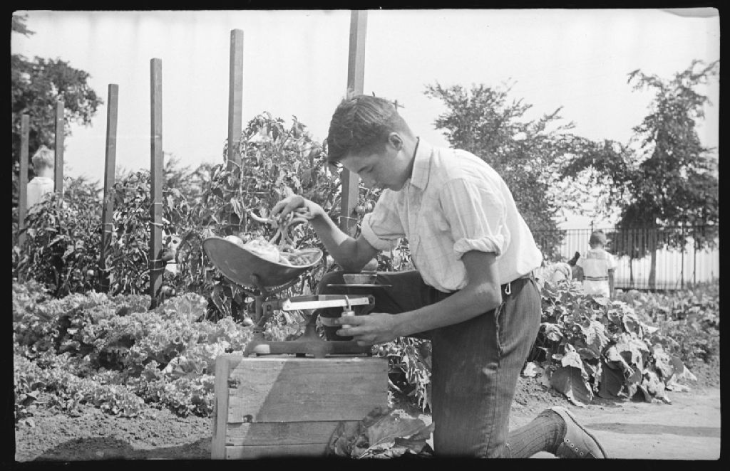 Un adolescent, Gérard Dragon, pèse des légumes sur une balance à poids posée sur une caisse de bois dans un potager