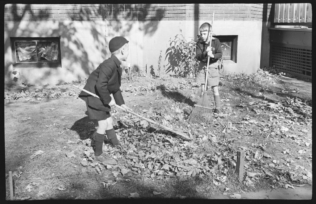 Deux garçons, Jerry Greenwood et un ami, ratissent des feuilles mortes avec des râteaux