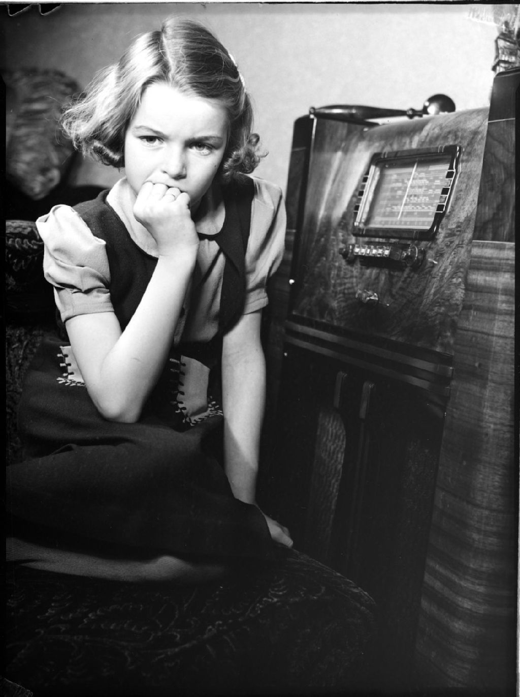 Une fillette, Pauline Luck, est assise à côté du meuble combiné avec radio et tourne-disque