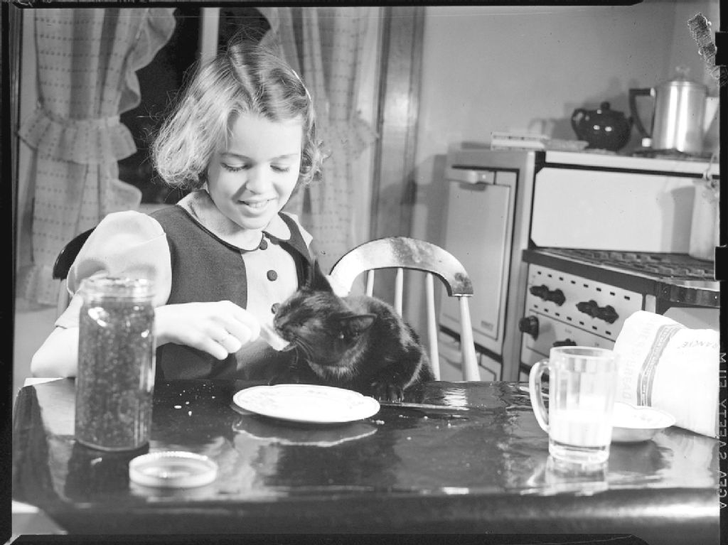 Une fillette, Pauline Luck, est assise à une table de cuisine et donne un morceau de tartine à son chat