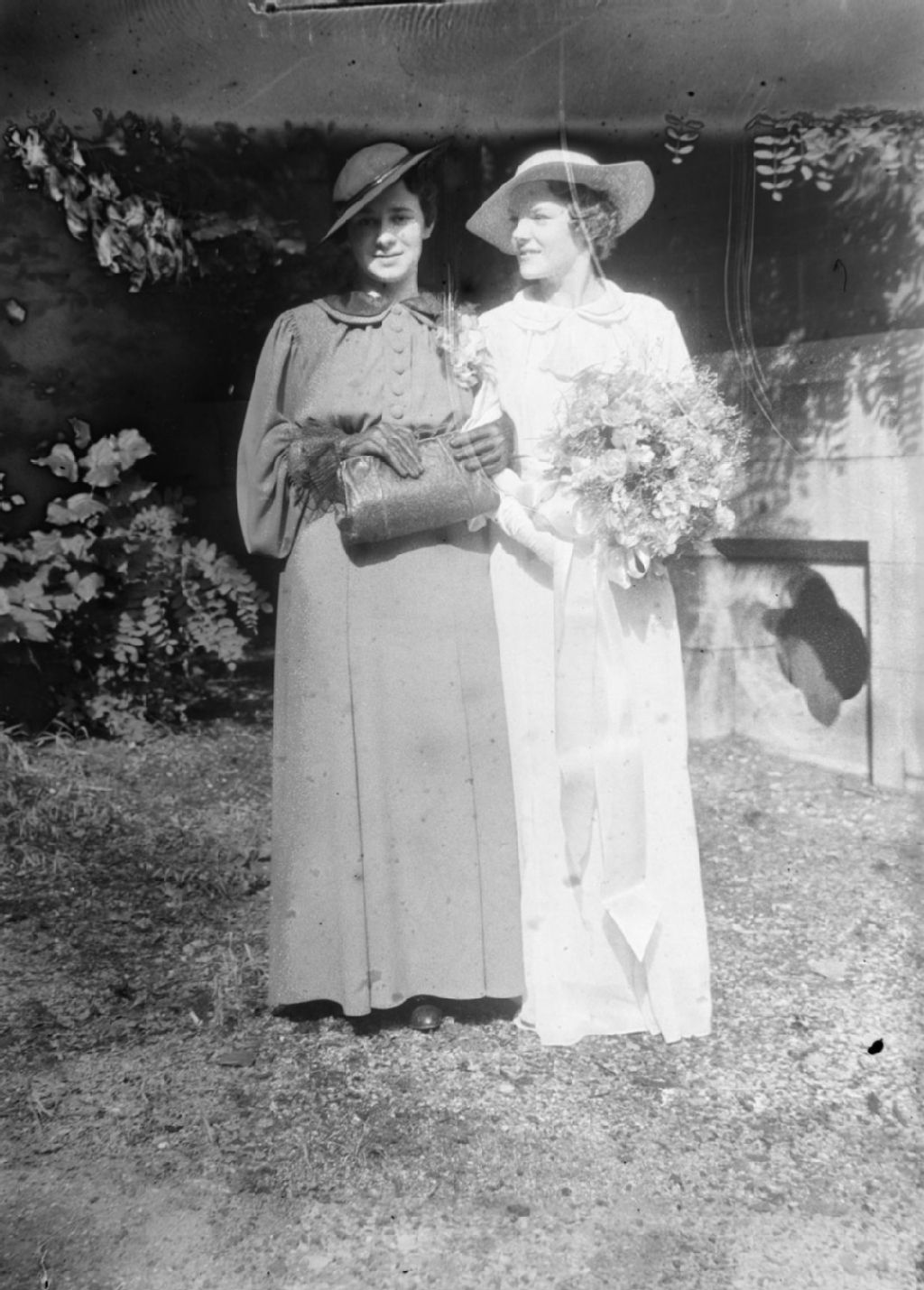 Deux femmes en grande toillette, robe longue et chapeau. La mariée tient un bouquet de fleurs