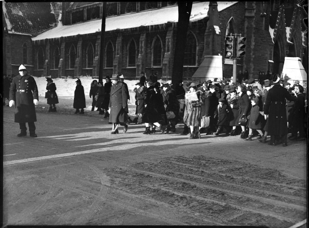 Nous voyons des acheteurs du temps des fêtes, dirigés par un policier, traverser à l'intersection de la rue Sainte-Catherine Ouest et de l'avenue Union à Montréal. À l'arrière-plan, nous apercevons la «Christ Church Cathedral» située au 635, rue Sainte-Catherine Ouest