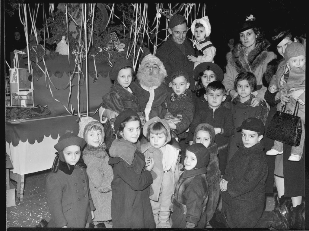 Le Père Noël est assis au milieu d'enfants lors de la distribution de cadeaux de Noël dans la salle d'exercices militaires, le «Drill Hall», situé au 175, rue Craig Est à Montréal