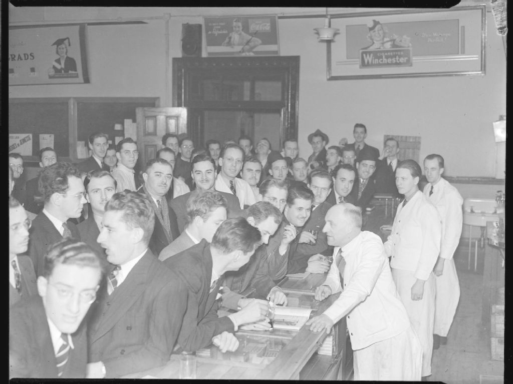 Nous voyons des étudiants rassemblés au restaurant chez «Joe's» sur le campus de l'Université de Montréal. Nous remarquons des affiches publicitaires de Coca-Cola et des cigarettes Winchester