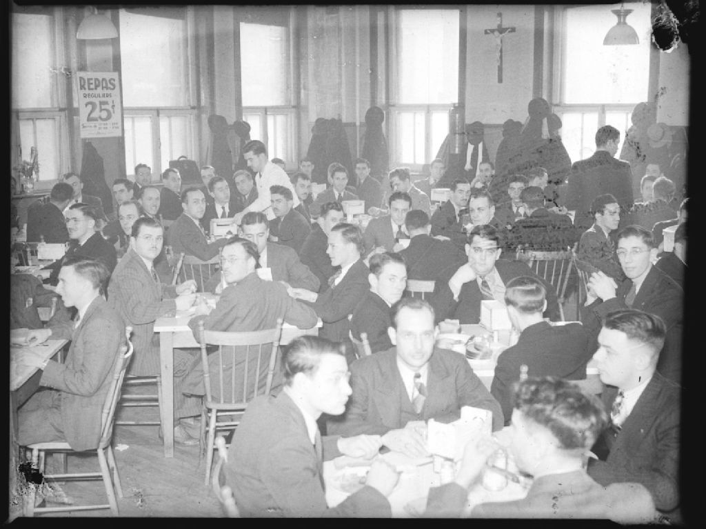 Nous voyons des étudiants assis autour de petites tables dans la salle à manger d'un pavillon de l'Université de Montréal. Nous remarquons au mur une affiche indiquant que les repas réguliers coûtent 25 cents