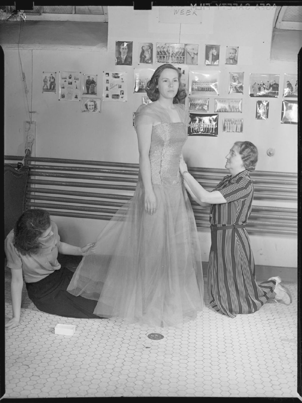 Deux couturières, dont mademoiselle D. Cameron, ajustent la robe d'une comédienne du spectacle «Red & White Revue» présenté par des étudiants de l'Université McGill. Sur le mur nous remarquons des photos de spectacles qui ont déjà été présentés