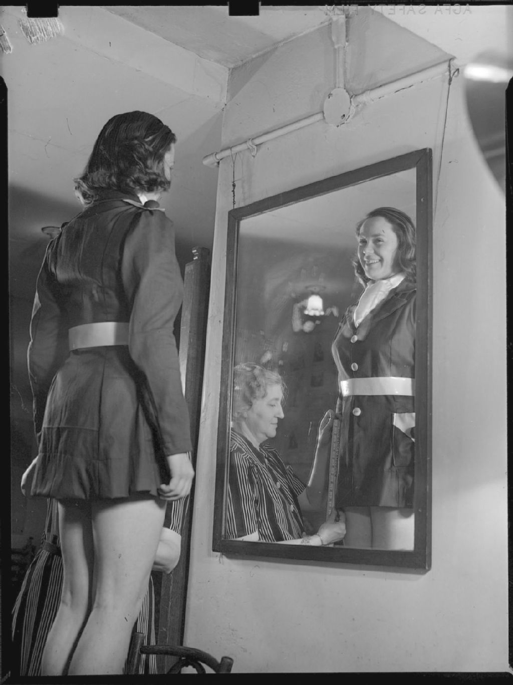 Une couturière, mademoiselle D. Cameron, ajuste le veston d'une comédienne du spectacle «Red & White Revue» présenté par des étudiants de l'Université McGill