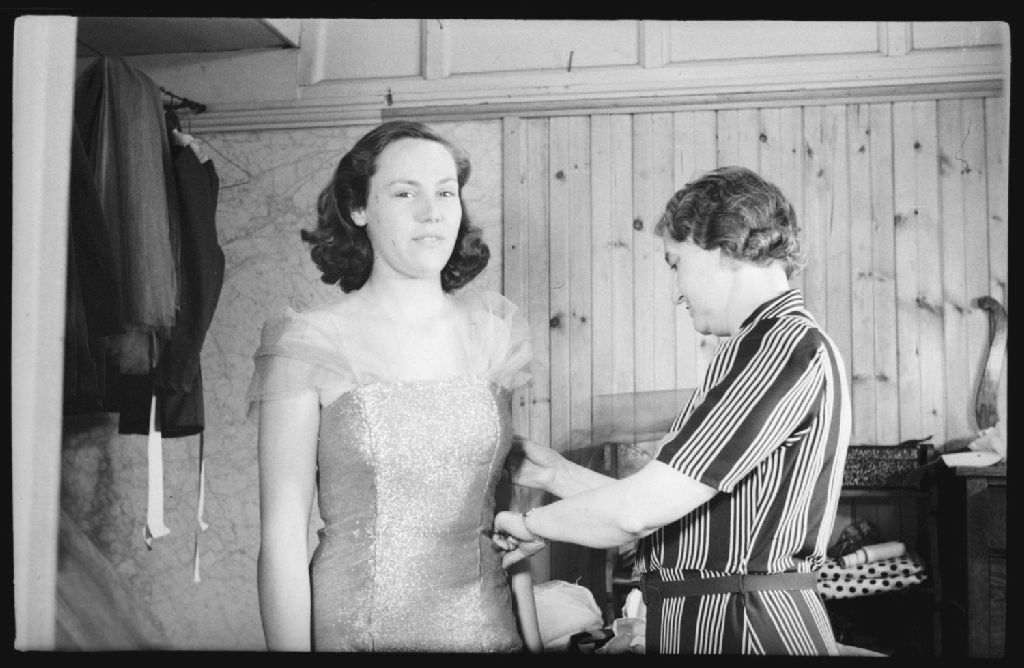 Une couturière, mademoiselle D. Cameron, ajuste la robe d'une comédienne du spectacle «Red & White Revue» présenté par des étudiants de l'Université McGill