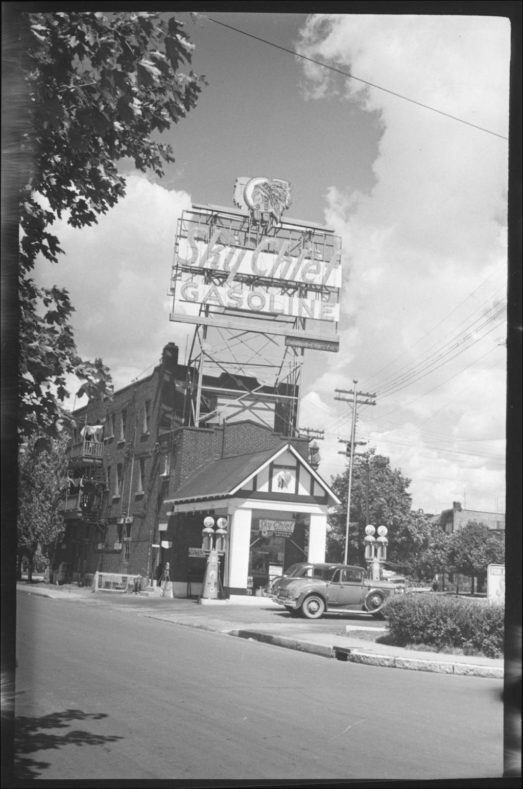 Nous voyons l'enseigne et la station-service «McColl-Frontenac Oil Company Limited», vendeuse de la «Sky Chief Gasoline». Cette station-service est située à l'intersection des rues Sherbrooke et Monkland à Montréal