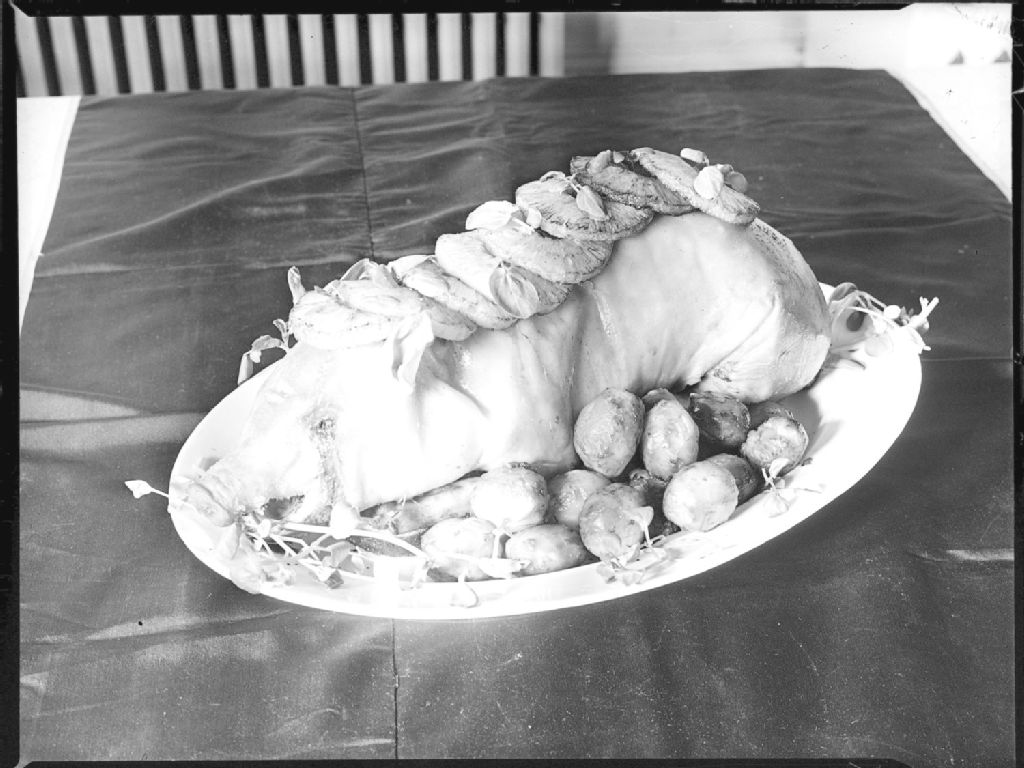 Nous voyons un rôti de porc préparé aux Écoles ménagères provinciales, rue Sherbrooke Est à Montréal