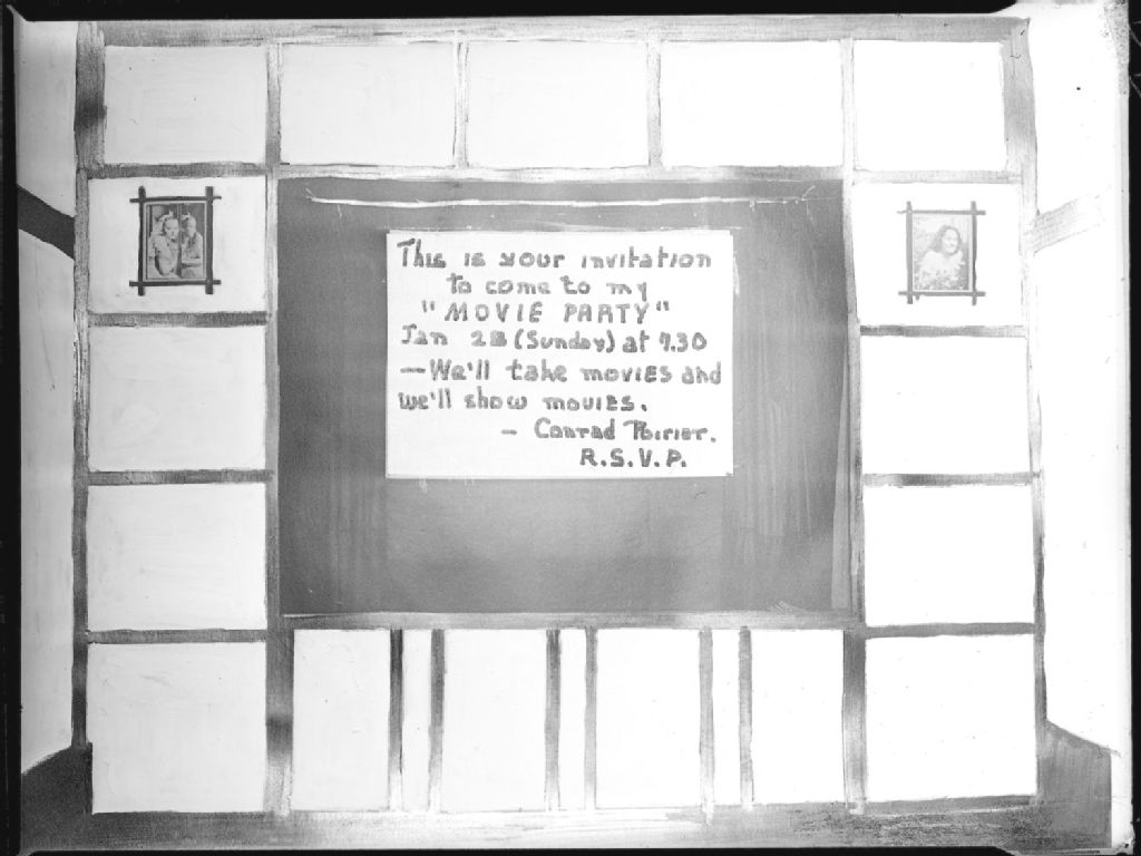 Nous voyons l'invitation de Conrad Poirier à son «Movie party» (soirée de présentation de films)