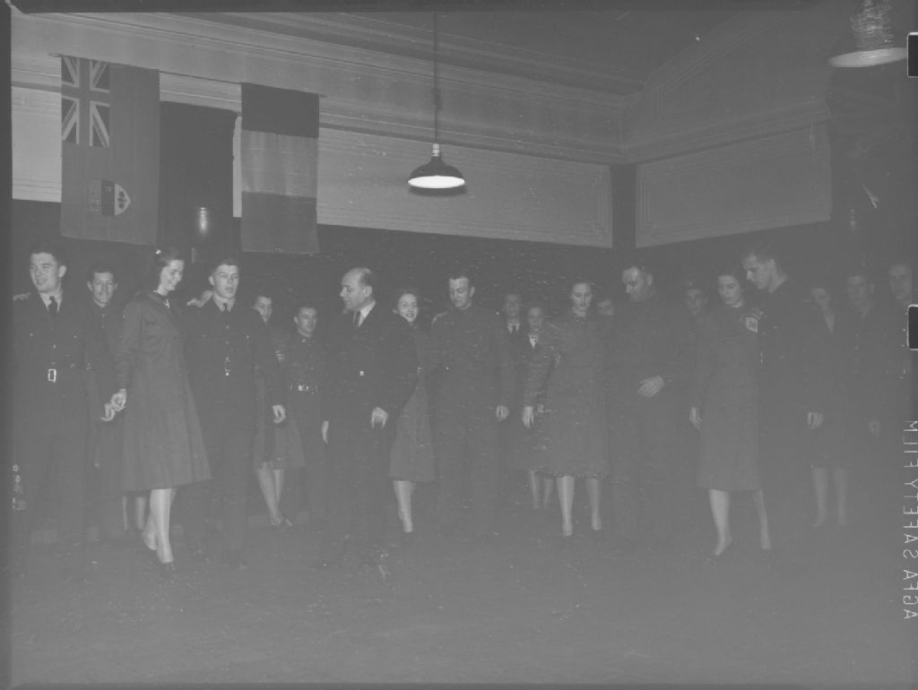 Monsieur Geo Shefler, professeur du cours de danse offert à la Young Men's Christian Association (Y.M.C.A.), enseigne les pas de base aux soldats et à leurs partenaires