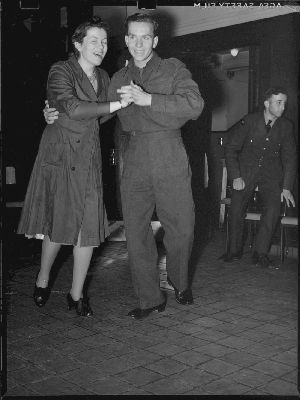 Nous voyons Peggy Cook danser avec le soldat Harold Devyer de la 5e batterie de campagne de Sherbrooke (Québec). Ils sont au cours de danse de la Youth Men's Christian Association (Y.M.C.A.)