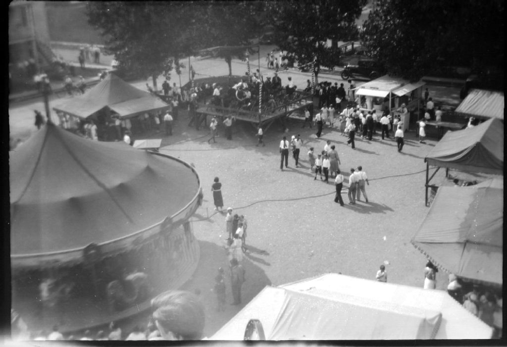 Nous voyons la foule circulant parmi les différents stands et manèges, dont le carrousel, de la fête champêtre des employés du Canadien National (CN) qui se déroule à Lachine