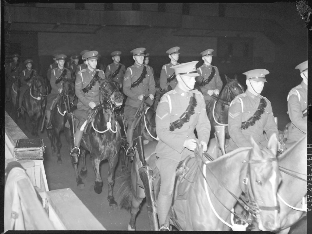 Des cavaliers du régiment «17th Hussars» défilent en rang dans une caserne de Montréal