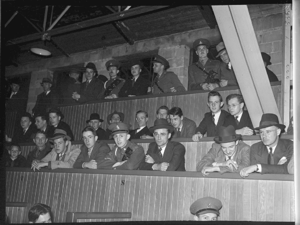 Des officiers et des recrues du régiment «17th Hussars» sont assis dans les gradins d'une caserne lors d'un exercice militaire à Montréal