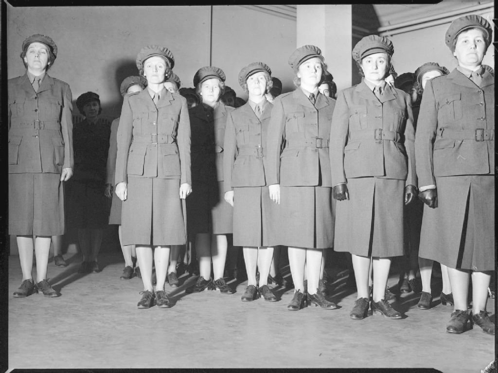 Nous voyons des femmes en uniforme de la brigade numéro 12 de la Croix-Rouge posant au garde-à-vous lors d'un entraînement à la «Queen's School» située au 208, avenue Olivier à Westmount