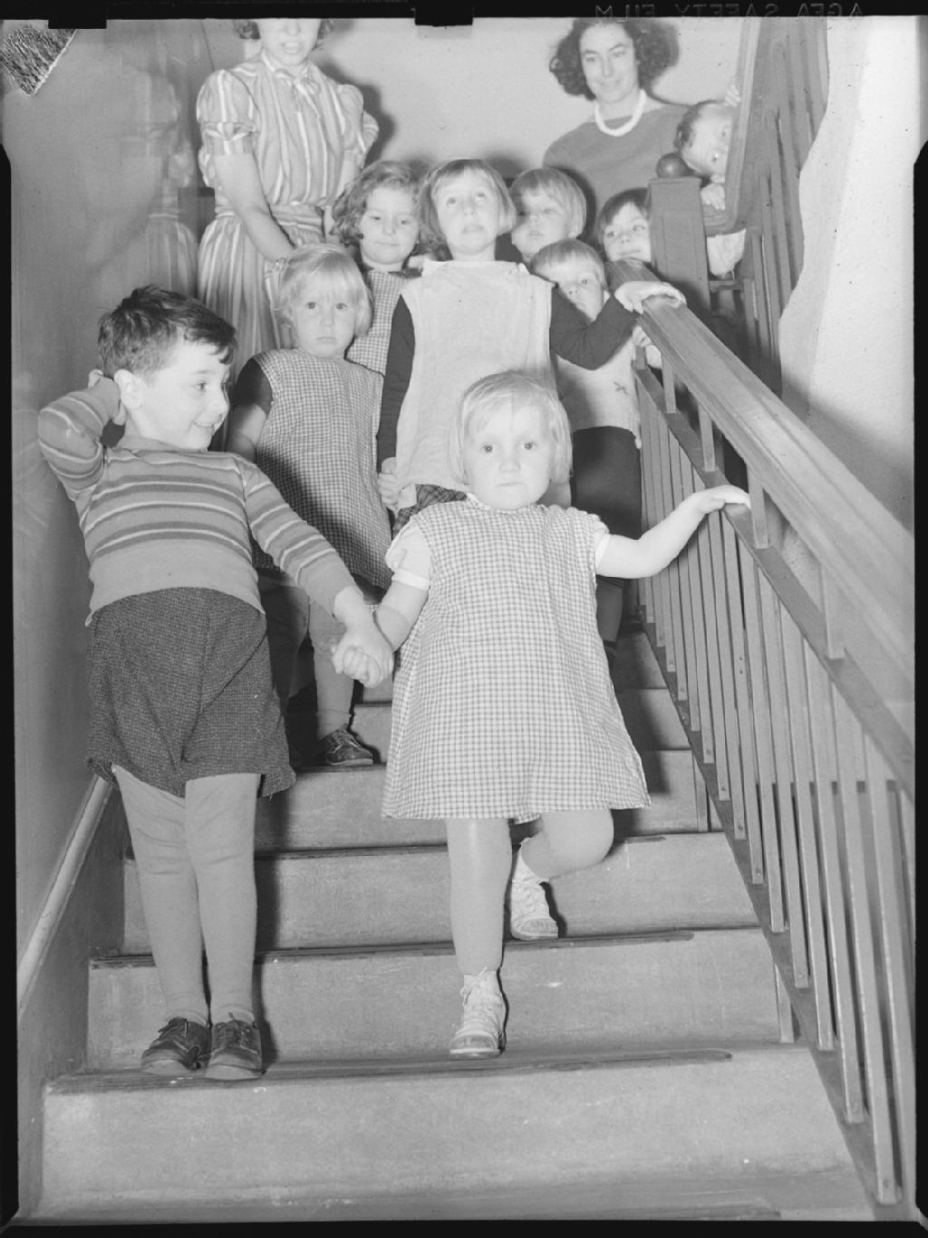 Les petits Leonard Hoffman et Martha Pedersen, main dans la main, descendent l'escalier de la garderie qu'ils fréquentent. Ils sont suivis d'autres enfants et d'éducatrices