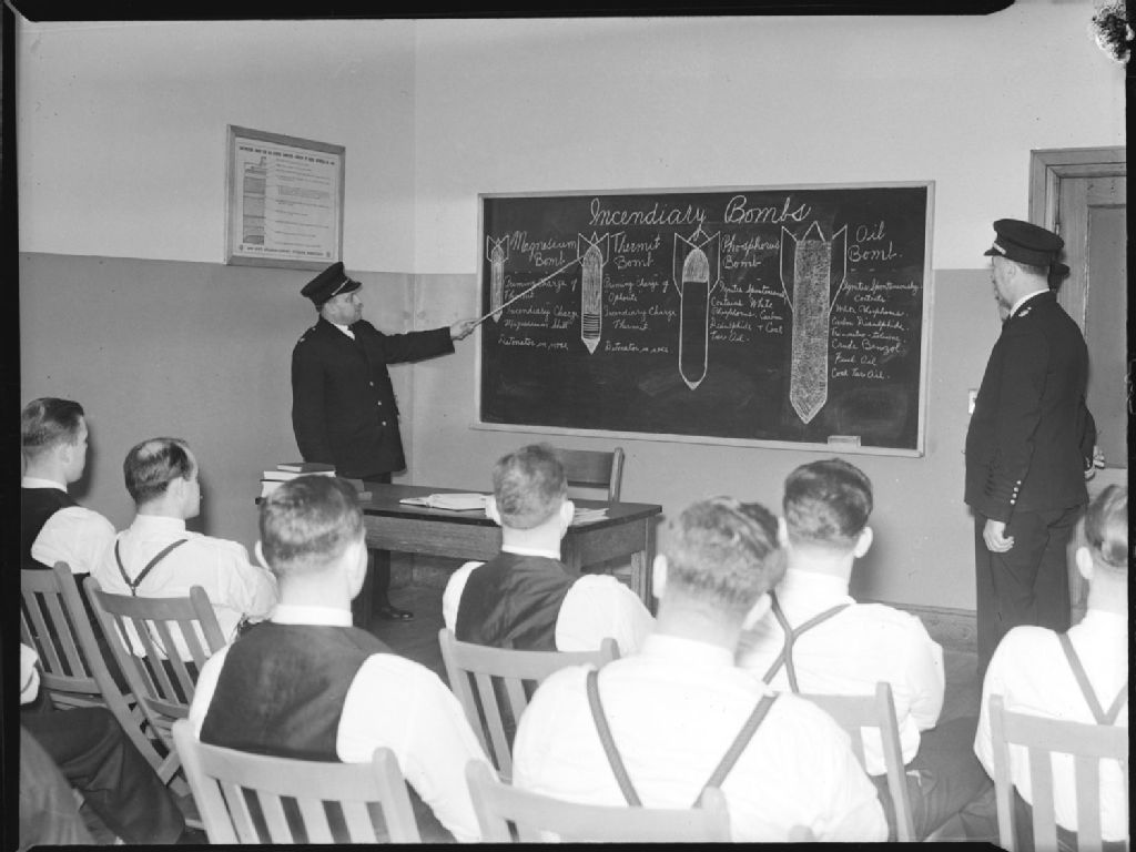Des instructeurs décrivent aux élèves-pompiers les caractéristiques des quatre types de bombes incendiaires qui sont illustrés au tableau