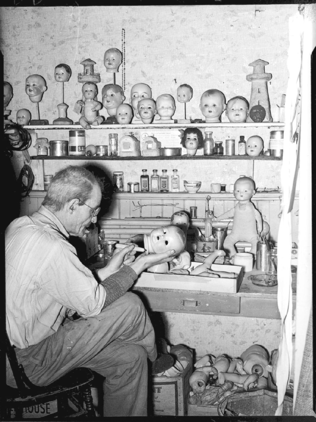 Monsieur Bernier répare une tête de poupée dans son atelier situé au 2027, avenue Metcalfe à Montréal