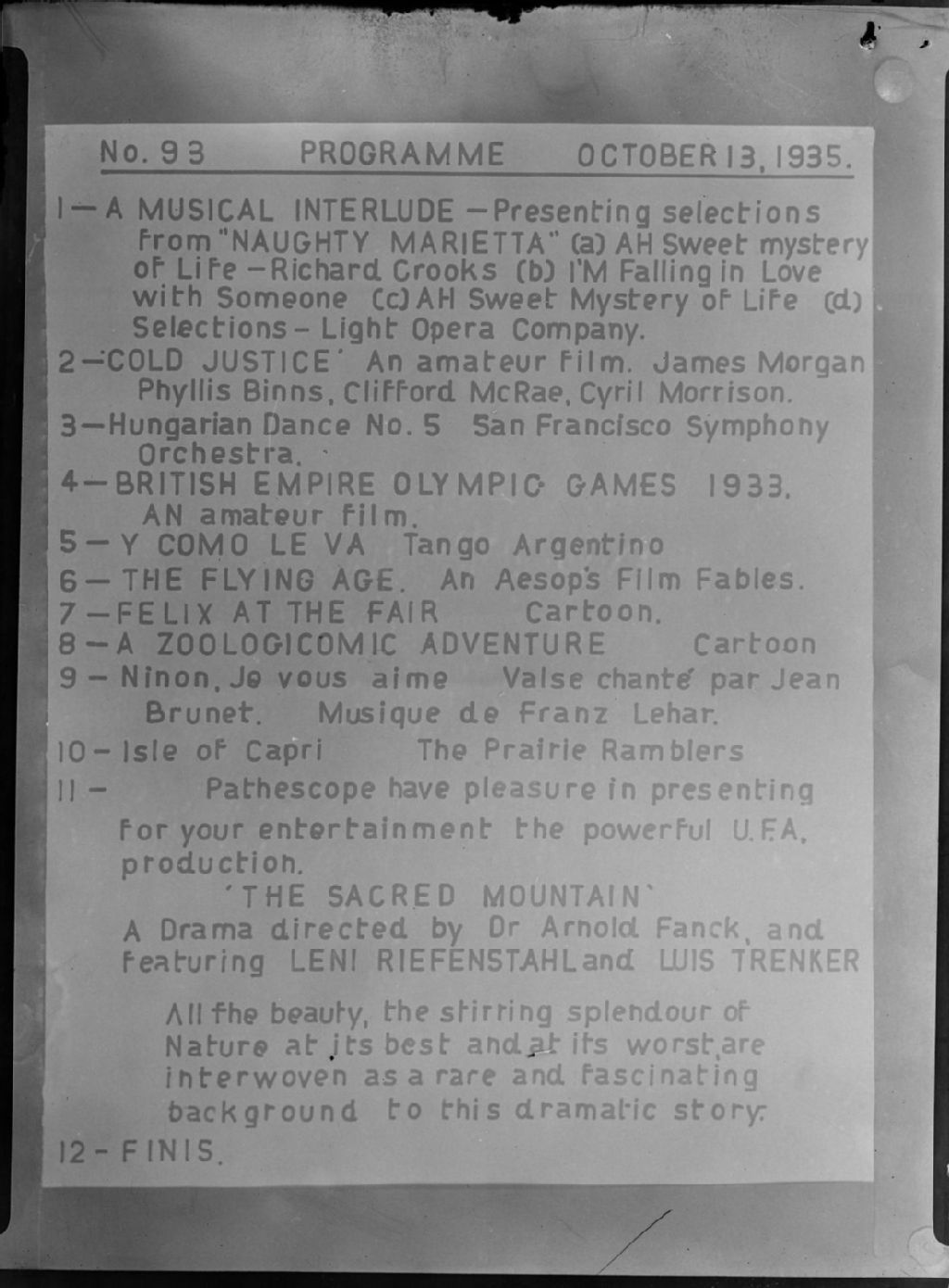 Affiche annonçant les films qui seront projetés le 13 octobre 1935. Parmi les titres de films, nous remarquons le titre "Cold Justice". Les acteurs de ce film sont les amis de Conrad Poirier