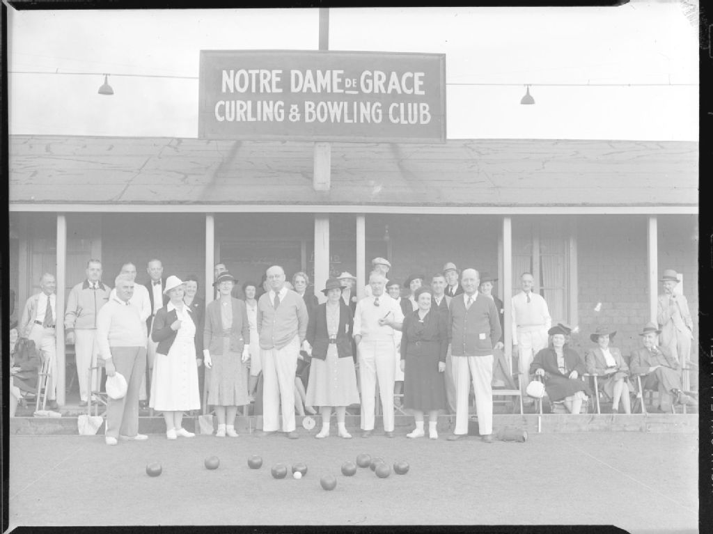 Nous voyons des membres du Club de curling et de bowling Notre-Dame-de-Grâce disputant une partie de pétanque devant l'édifice du club