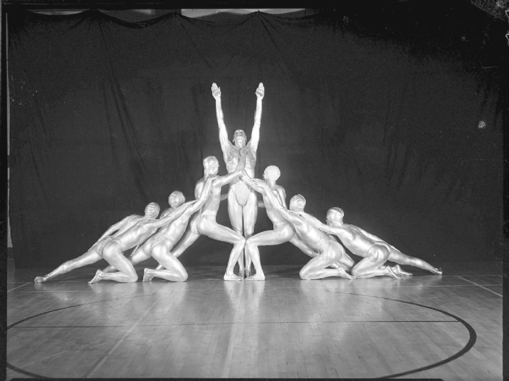 Lors d'un spectacle intitulé «Men of Bronze» présenté dans le gymnase de la Young Men's Christian Association (Y.M.C.A.) de Westmount, des gymnastes exécutent un tableau sur le thème de l'aspiration