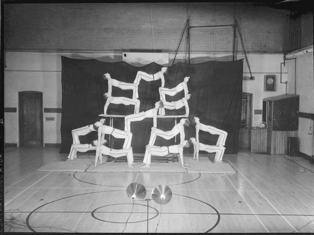 Nous voyons des gymnastes exécutant une figure pyramidale à l'aide de barres parallèles dans le gymnase de la Young Men's Christian Association (Y.M.C.A.) de Westmount