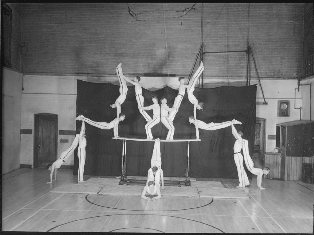 Nous voyons des gymnastes exécutant une figure pyramidale à l'aide de barres parallèles dans le gymnase de la Young Men's Christian Association (Y.M.C.A.) de Westmount
