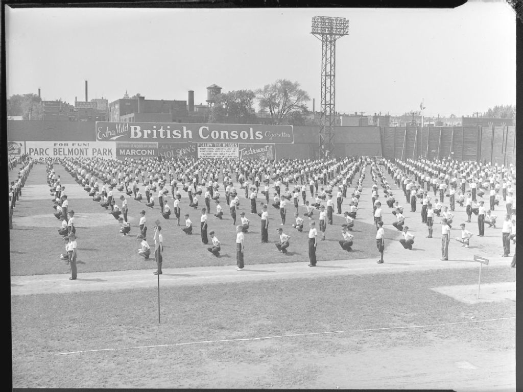 Lors d'une journée d'athlétisme des écoles catholiques de Montréal, de nombreux élèves font de la gymnastique dans le stade Delorimier. À l'arrière-plan, nous voyons des panneaux-réclame des cigarettes British Consol et de différents produits et services