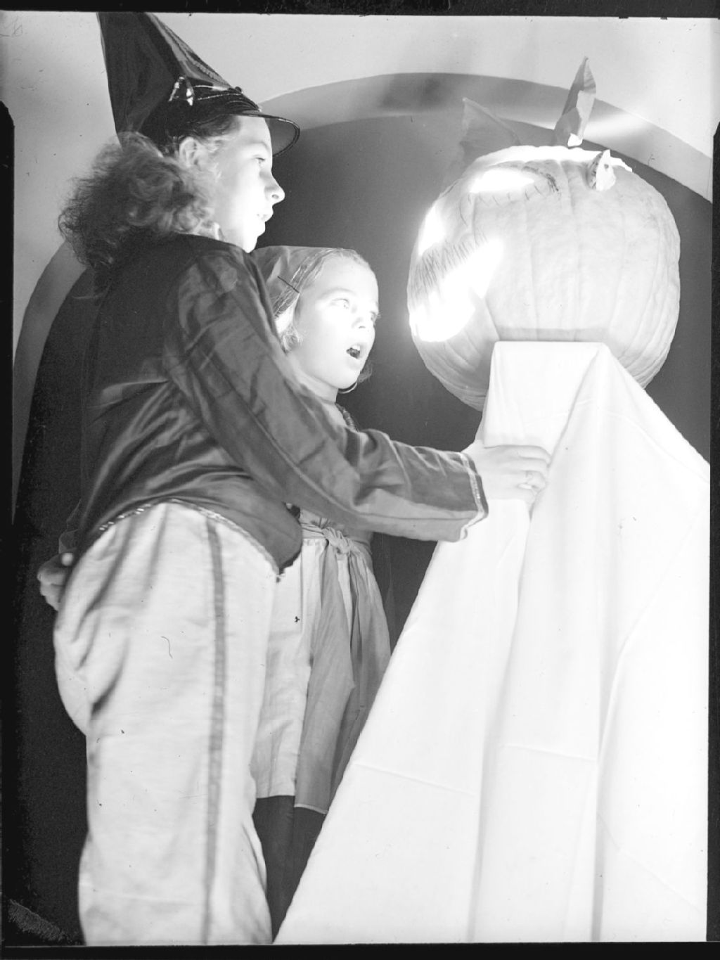 Deux fillettes, Pauline et Dorothy Luck, sont debout devant une citrouille d'halloween placée sur un socle