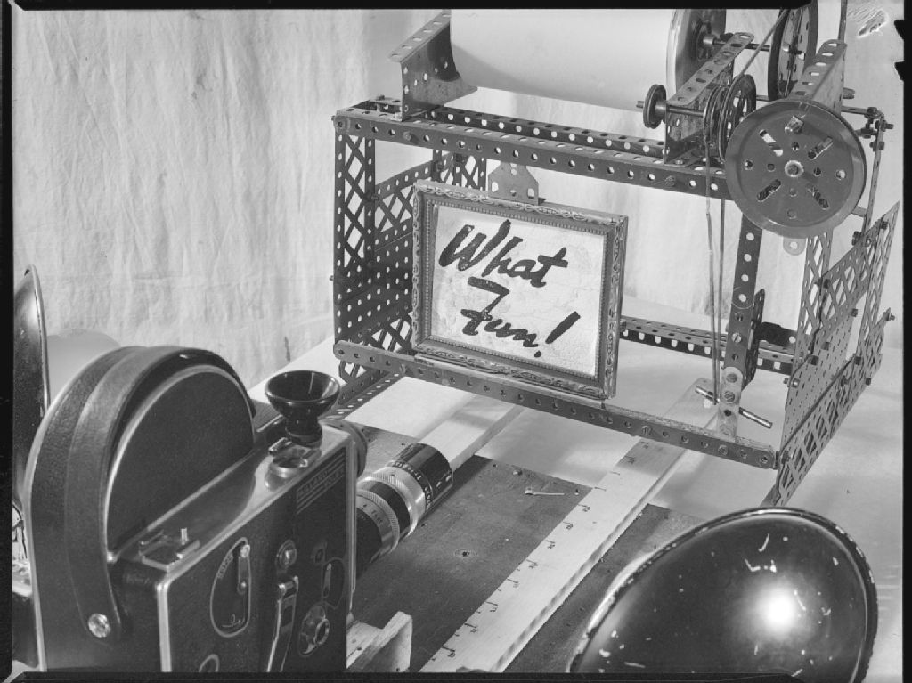 Nous voyons tout le montage artisanal qui permet de présenter le générique des films d'amateurs sur l'écran du photographe Conrad Poirier. Nous lisons le générique: «What Fun!»