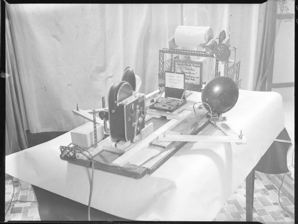 Nous voyons tout le montage artisanal qui permet de présenter le générique des films d'amateurs sur l'écran du photographe Conrad Poirier