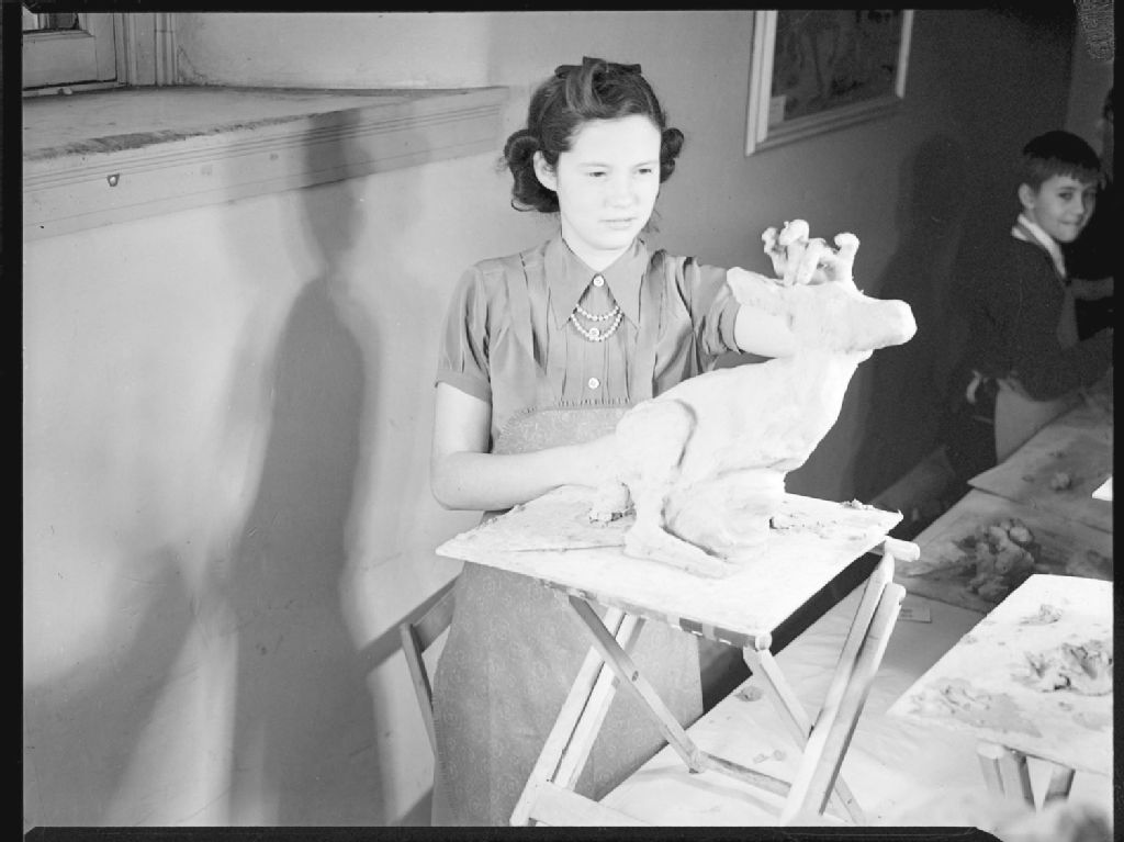 Suzanne Clarke fait de la sculpture avec de la terre glaise dans les locaux de l'«Art Association» de Montréal situés au 1379, rue Sherbrooke Ouest