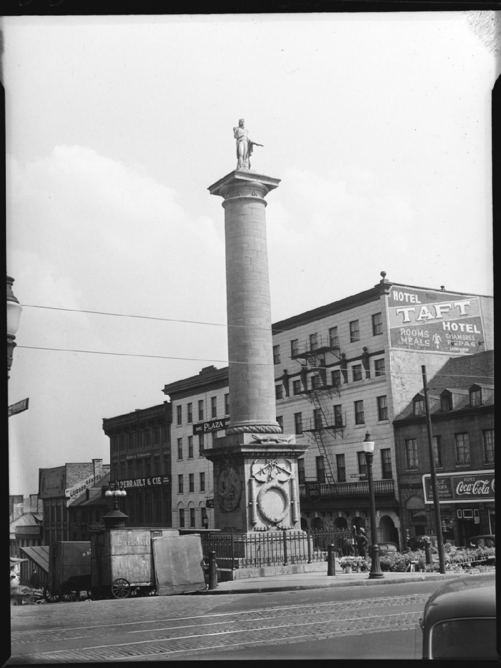 La colonne Nelson se trouve au milieu de la Place Jacques-Cartier dans le Vieux-Montréal. Nous remarquons les hôtels Taft et Plaza ainsi que le commerce des imprimeurs et relieurs J. Perrault & Cie