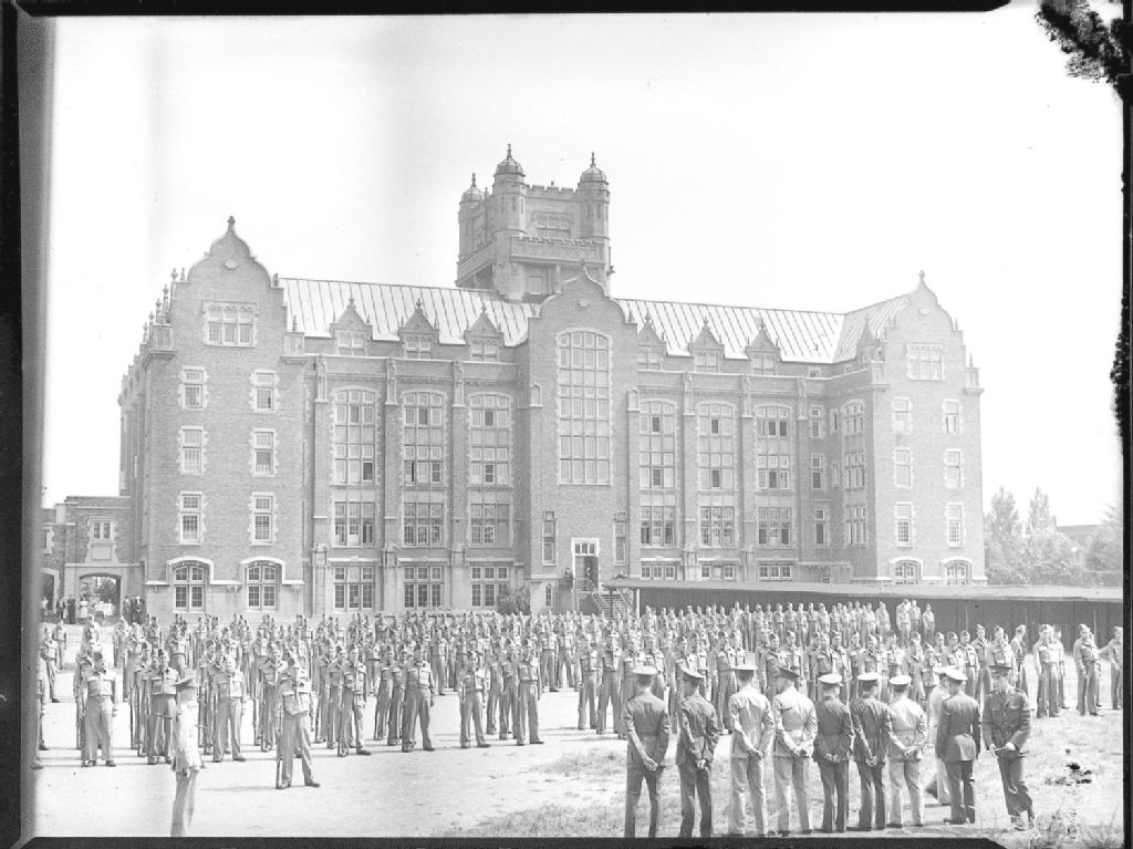 Nous voyons des jeunes militaires faisant partie du Canadian Officers Training Corps (C.O.T.C.) devant le Collège Loyola situé au 7141, rue Sherbrooke Ouest à Montréal