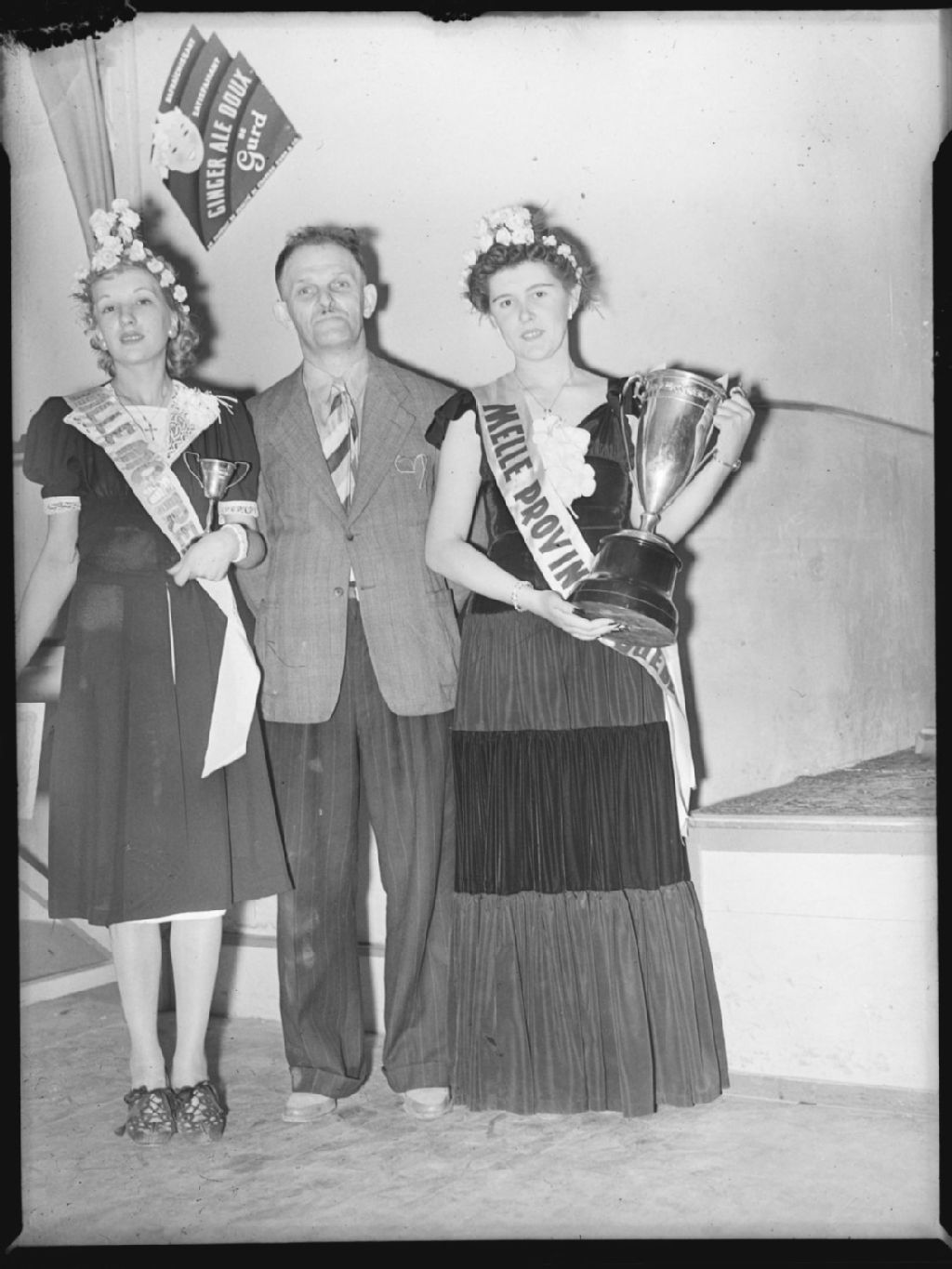 Nous voyons deux concurrentes et un juge d'un concours de beauté provincial. La gagnante, Mignonne Côté de Sainte-Rose, tient le trophée de mademoiselle Province de Québec. Le concours avait lieu dans les locaux de l'Association sportive canadienne situés au 1097, rue Saint-Denis à Montréal
