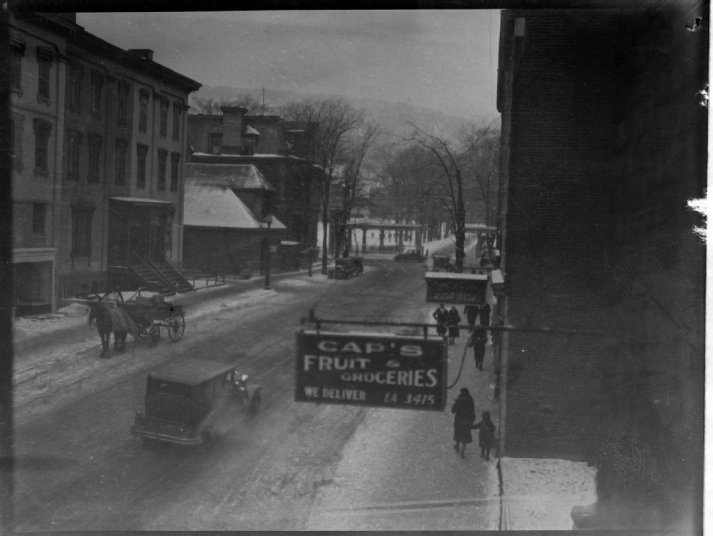 Montréal, vue de la rue Sherbrooke près de l'Université McGill. En arrière-plan, nous voyons le portique à colonnades qui caractérise cette université. Nous apercevons également l'enseigne d'une épicerie et d'autres magasins. Une automobile et une voiture tirée par un cheval circule dans la rue
