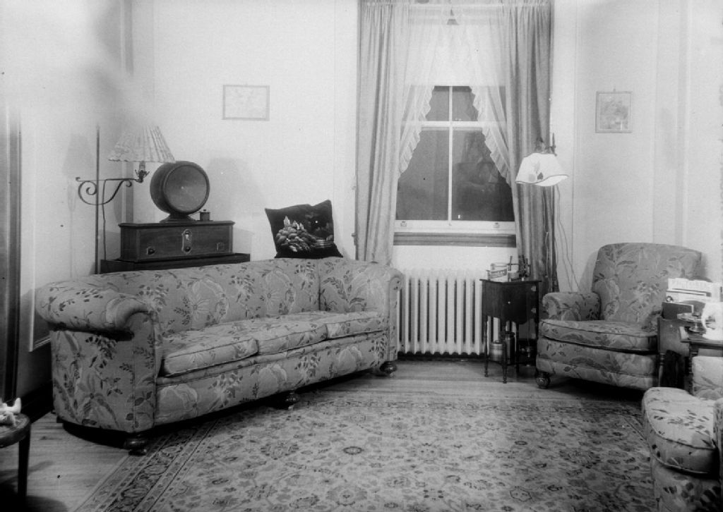 Salon d'une maison bourgeoise. Nous voyons un canapé, un fauteuil, des lampes, une table à café et un radio