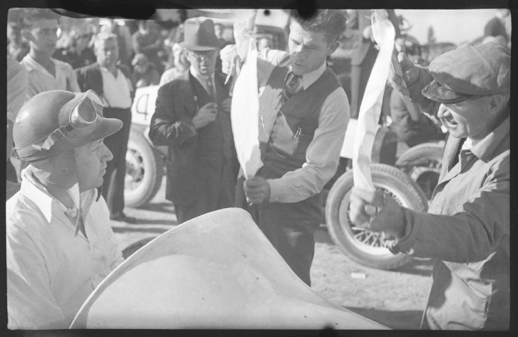 Racing. Getting Instructions. Rider Cliff Dronofsky, 8 septembre 1940, Archives nationales à Montréal, Fonds Conrad Poirier, (06M,P48,S1,P5716), Poirier, Conrad.