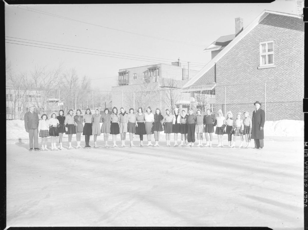 Nous voyons des patineuses et deux entraîneurs d'un cours de patinage artistique donné sur la patinoire extérieure de la Young Men's Christian Association (Y.M.C.A.) de Notre-Dame-de-Grâce à Montréal