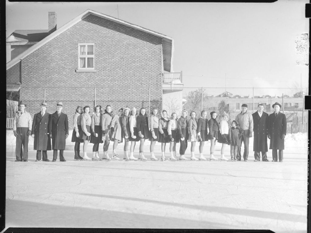 Nous voyons des patineuses et des entraîneurs du cours de patinage artistique donné sur la patinoire extérieure de la Young Men's Christian Association (Y.M.C.A.) de Notre-Dame-de-Grâce à Montréal
