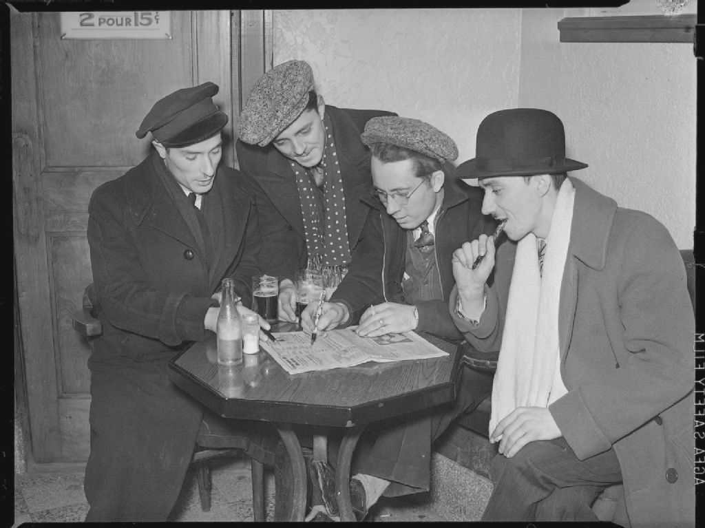 Quatre hommes répondent à un questionnaire sur le hockey paru dans un journal. Ils sont assis autour d'une table de la taverne Papineau située au 1702, rue Ontario Est