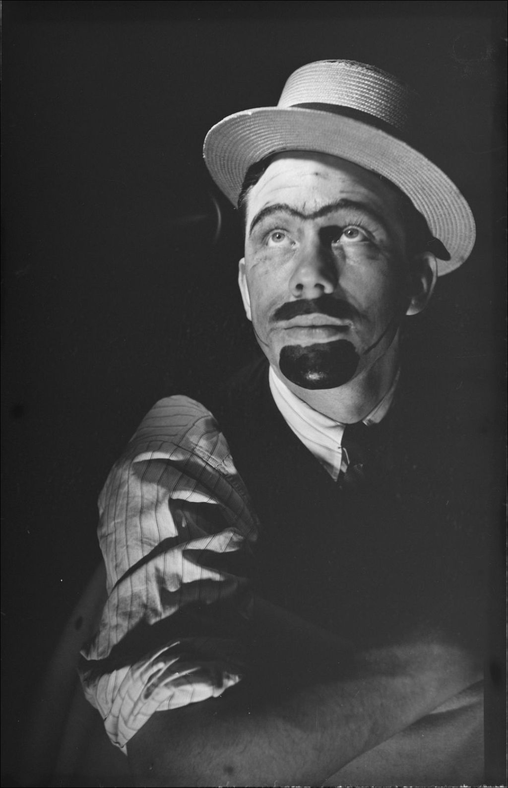 Jack Hale pose avec une barbe postiche et porte un canotier