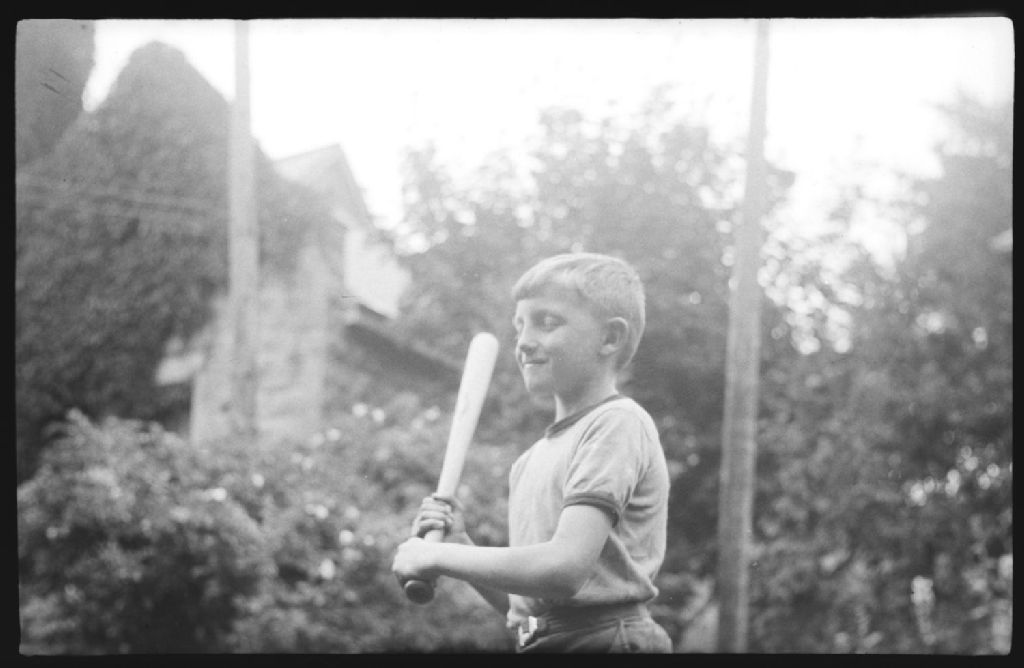 Un petit garçon, Bobby Fraser, tient un bâton de baseball