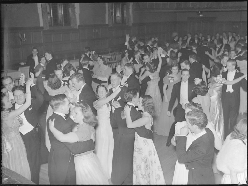 Nous voyons des couples danser au bal des diplômés de Westmount ou «Westmount Hi-Y Grads Dance»